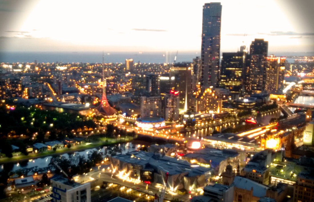 Melbourne, Victoria, Australia Taken from Sofitel Melbourne On Collins, looking out over Southbank and out to Port Phillip Bay. A longer exposure and an unsteady hand led to the blurring, but the resulting effect of the blocks of colour against the dark buildings and early evening sky is nice.